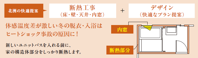 体感温度差が激しい冬の脱衣・入浴はヒートショック事故の原因に!北洲リフォームでは新しいユニットバスを入れる前に、家の構造体部分をしっかり断熱します。