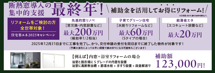 住宅省エネ2025キャンペーンを活用してリフォームをご希望の方はまだ間に合います!2025年12月31日までに補助金交付申請を済ませることが必要です。詳しい補助金内容は会場で個別に試算させていただきます。