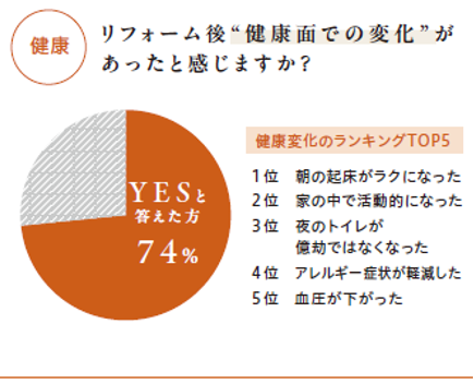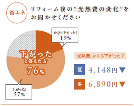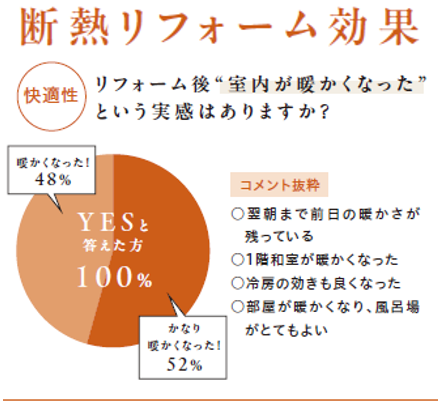 断熱リフォーム後、多くの方が快適性・健康・省エネ効果を実感されています。「室内の暖かさを実感(52%)」「朝の起床がラクになった等の健康面での変化の実感(74%)」「光熱費が下がった(76%)」等。