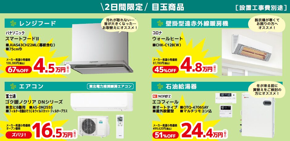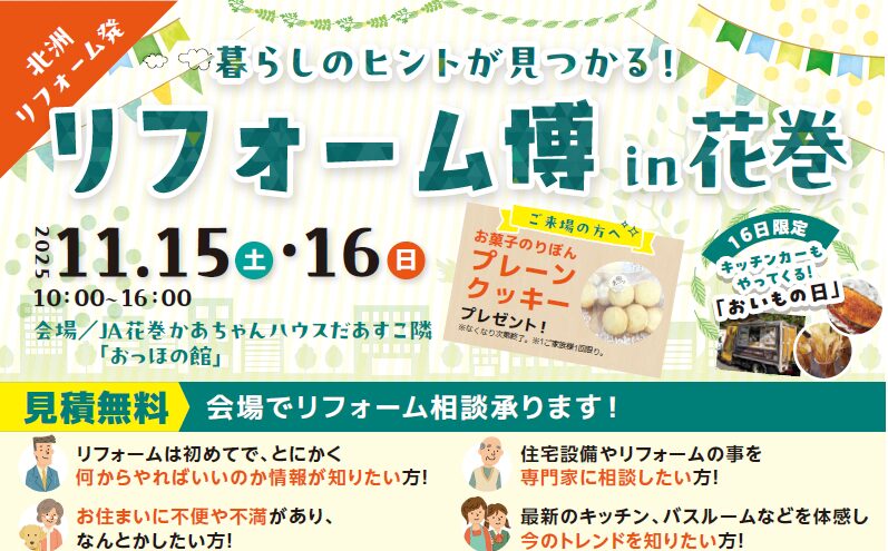 北洲リフォーム北上支店では、11/15㊏・16㊐の2日間、花巻市野田エリアにあるJA花巻かあちゃんハウスだぁすこ隣「おっほの館」にて花巻リフォーム博&お見積もりキャンペーンを開催いたします。パナソニック・TOTO・LIXILの3大メーカーが集結し、実際に最新の設備機器をご覧いただきながらご相談や専門スタッフから直接話を聞くことが可能です。