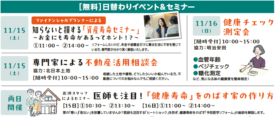 ■11/15㊏16㊐北洲スタッフによるセミナー【医師も注目!「健康寿命」をのばす家のつくり方】