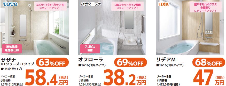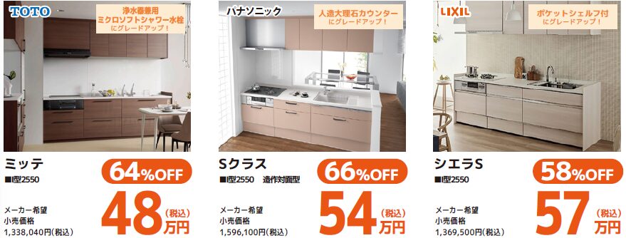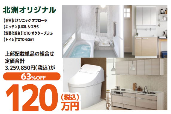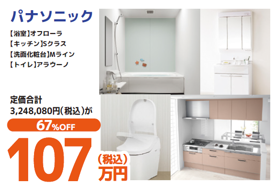 浴室:パナソニック オフローラ/キッチン:LIXIL シエラS/洗面化粧台:TOTO オクターブLite/トイレ:TOTO GGA1