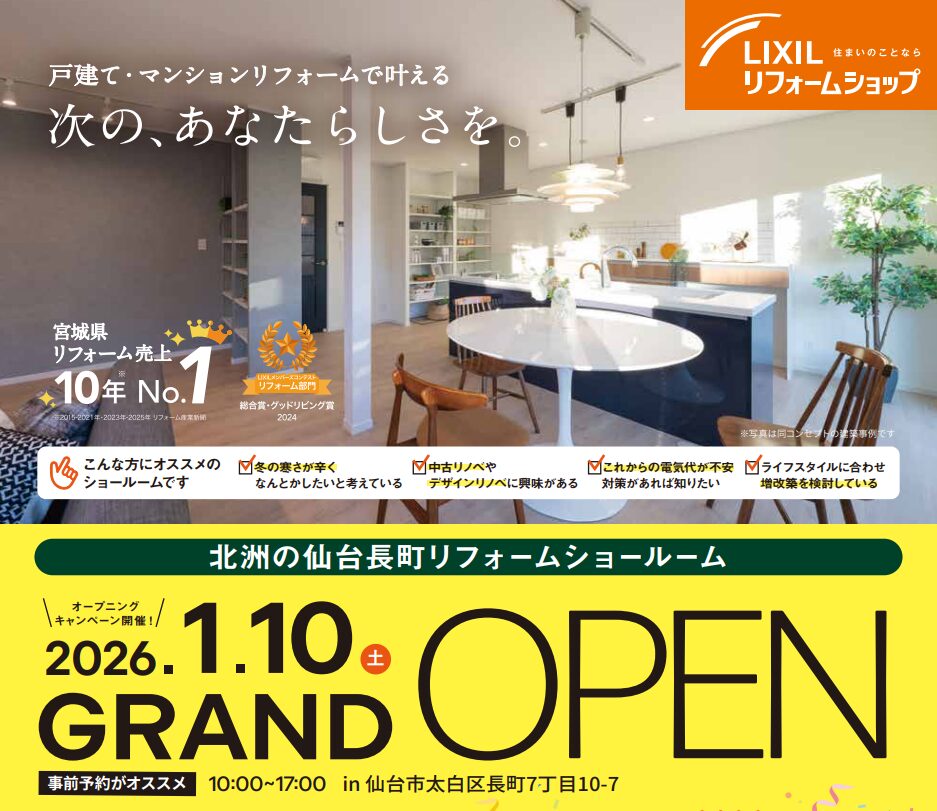 北洲リフォームは2026年1月10日㊏仙台長町エリアに新ショールームをオープンいたします。