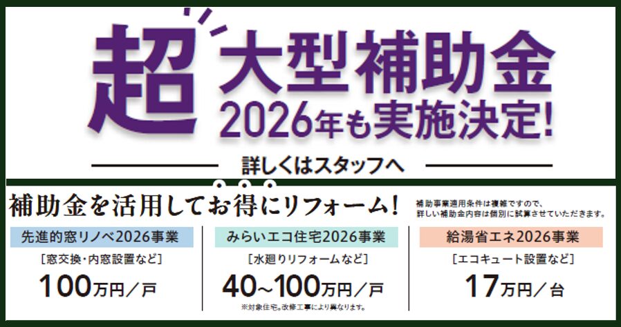 窓(窓交換・内窓設置)、水まわり設備交換、給湯器(エコキュート設置など)リフォームをお考えの方はお気軽にご相談ください。北洲ではお見積もり時に補助額試算をご提示しています。申請もお任せください。この機会を活用してお得に省エネあったかリフォームしませんか。