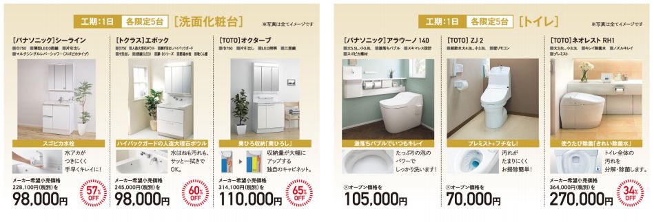 単なる設備の交換だけでなく、家族構成や暮らしの変化に合わせてお部屋全体を見直すリフォームのお手伝いをします。厳選のオススメ水まわり商品を、限定各5台となります。お考えの際はお早めにお声がけください。