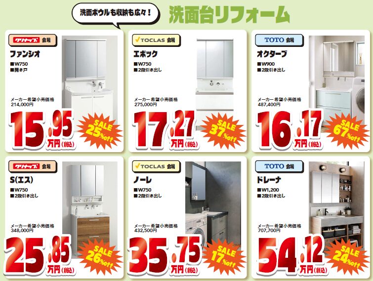 >>洗面台リフォーム【クリナップ/トクラス/TOTO会場】