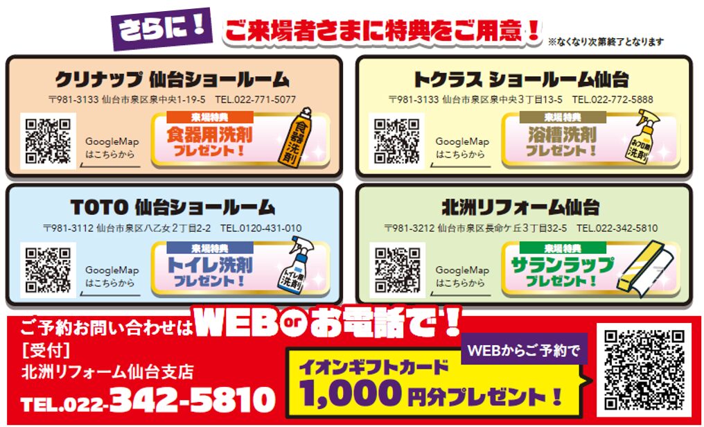 【抽選会場】クリナップ仙台ショールーム・TOTO仙台ショールーム・トクラスショールーム仙台・北洲リフォーム仙台