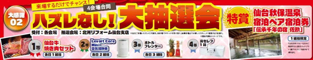 ※当日ご来場いただいた方限定。各会場でチケットを受け取り、抽選会場(北洲リフォーム仙台)までお越しください。