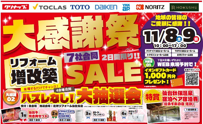 11/8㊏・9㊐の2日間、日頃の地域の皆様のご愛顧に感謝を込めて、仙台市エリアの7社合同で『リフォーム増改築!大感謝祭SALE』を開催いたします。リフォームを検討している方はぜひご来場ください。