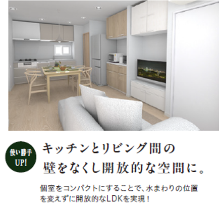 個室をコンパクトにすることで、水まわりの位置を変えずに開放的なLDKを実現!