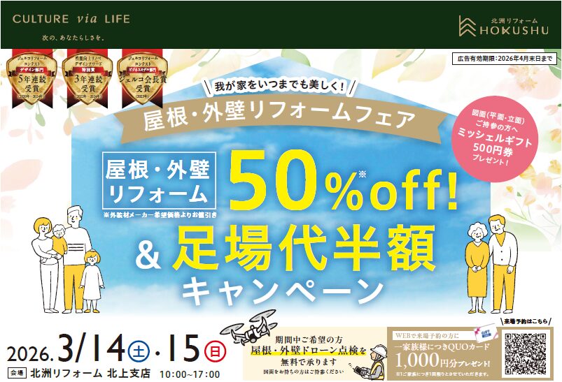北洲リフォーム北上支店では3/14㊏・15㊐の2日間、『屋根・外壁リフォーム50%OFF!&足場代半額キャンペーン』を開催いたします。リフォームを検討している方はこの機会をご活用ください。屋根・外壁ドローン点検無料実施中!