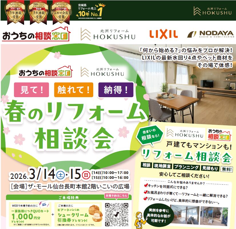 3/14㊏15㊐見て!触れて!納得!春のリフォーム相談会【仙台長町】