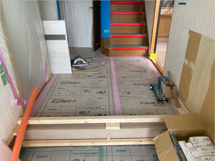 青いシートは床暖房です。壁側からクッションシートを敷き始めていて、この上から新しいフローリングを敷いていきます。