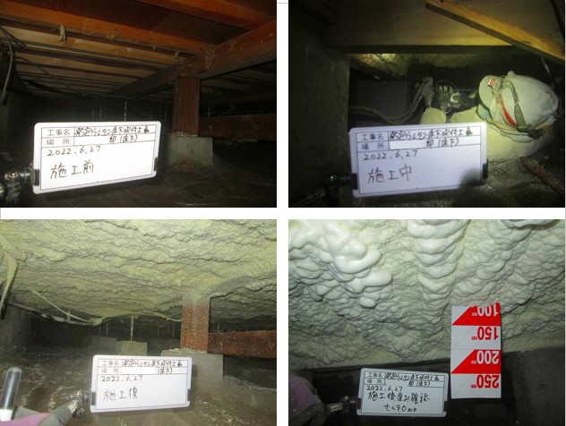 こちらは少し前ですが、床下断熱施工の様子です。その場で断熱材を発泡させ、9cmの厚みで床下にすき間なく吹付けています。床下からの冷気を防ぎます。