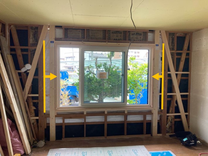 リビングの出窓だった部分です。こちらも窓幅を少し小さくすることで、両脇の壁が筋交いを伴う耐力壁となります。