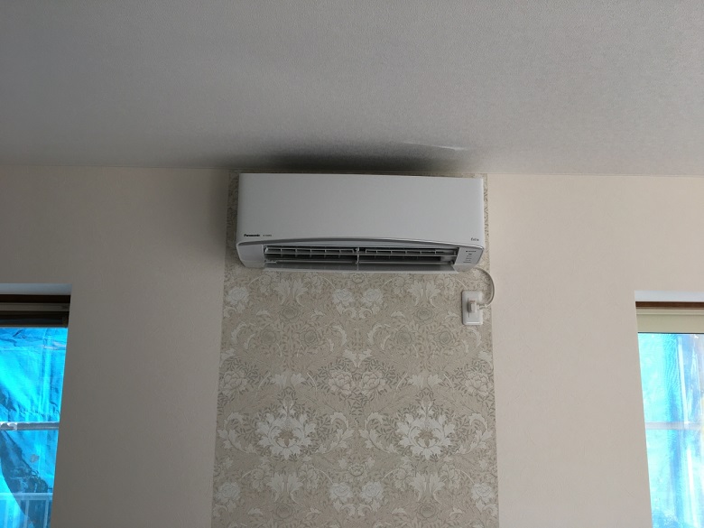こちらはリビングです。エアコンの部分には、アクセントとして柄のクロスを貼りました。こういう、部分使いもできるんですね。お部屋全体がどんな雰囲気になるのか楽しみです!