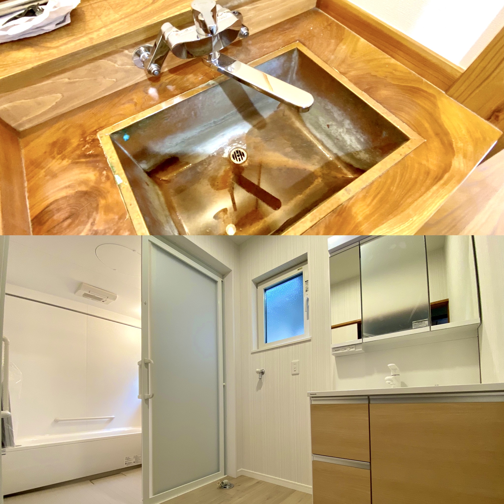 (上)トイレの外、廊下にある手洗い場です。冷たい水しか出なかったところを、下に小型の電気温水器を仕込むことで暖かなお湯が出るようになりました。銅製のシンクは以前のまま。