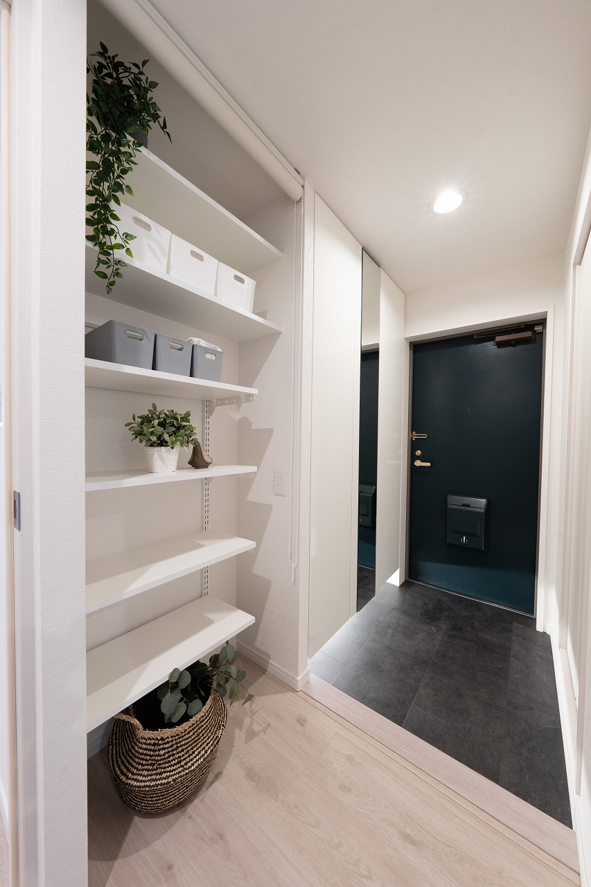 なるべく家具を置かないようにしたいというご要望から、洋室のクローゼットや玄関の収納量も見直しました。必要な部分はスペースを増やし、圧迫感を感じていた収納扉をインテリアに溶け込ませるようなロールスクリーンにすることで、上げ下げの調節ができ空間に広がりを持たせました。