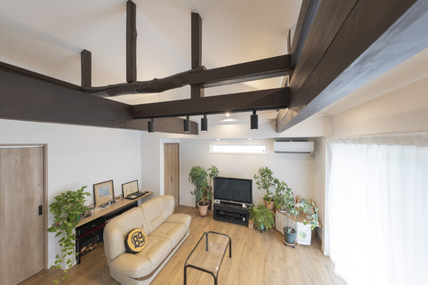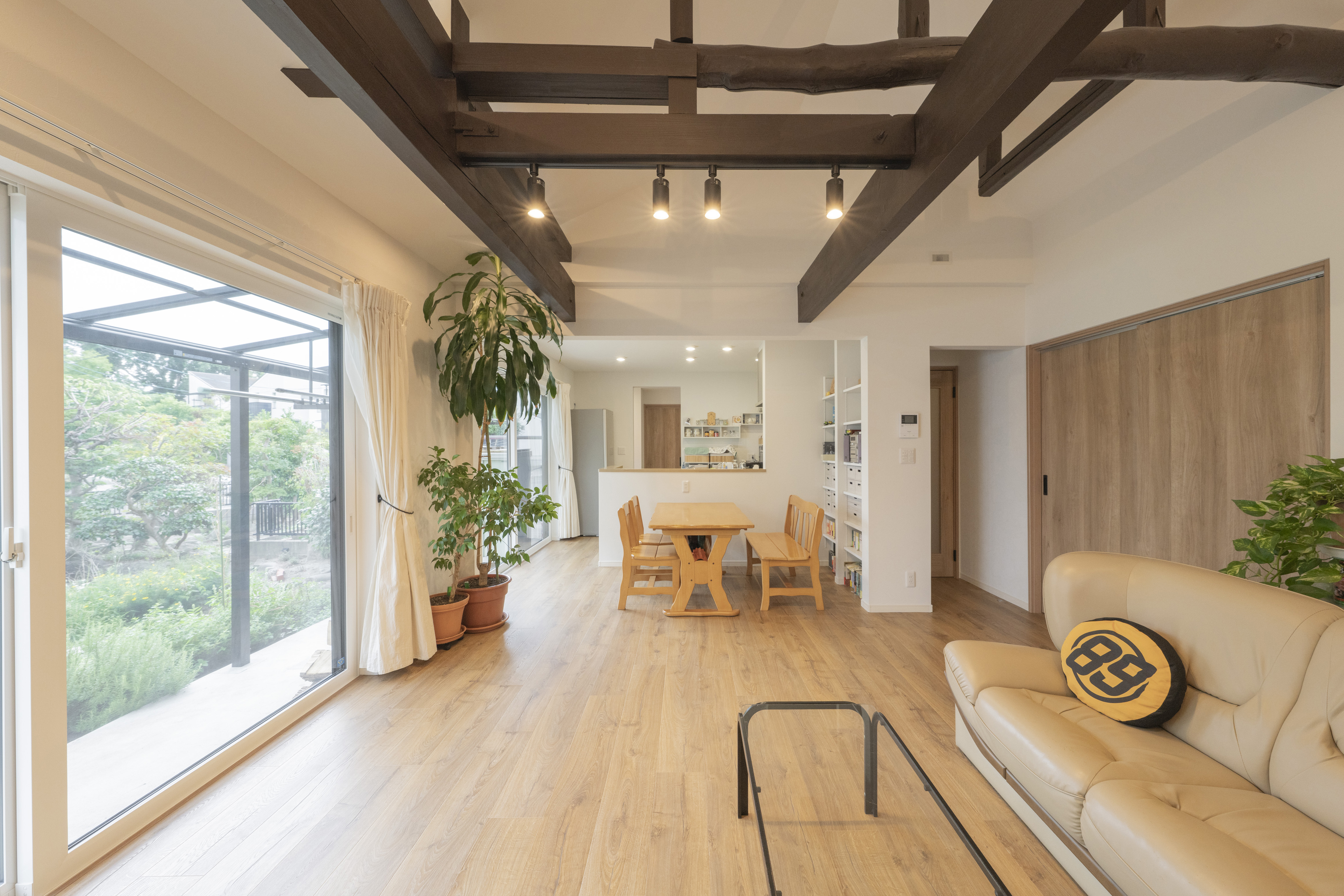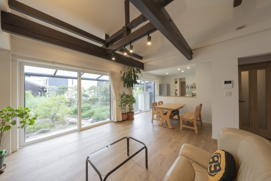 これまで増改築を繰り返してきた築70年の平屋を安心して快適に暮らすことのできる自分たちらしい住まいにフルリノベーション。既存の梁を残して魅せるリビングと明るい南面LDKへ一新されました。感染症対策にも活用できる寝室計画などこれからの暮らしを見据えた間取りへ設計。