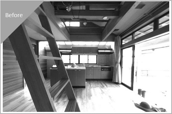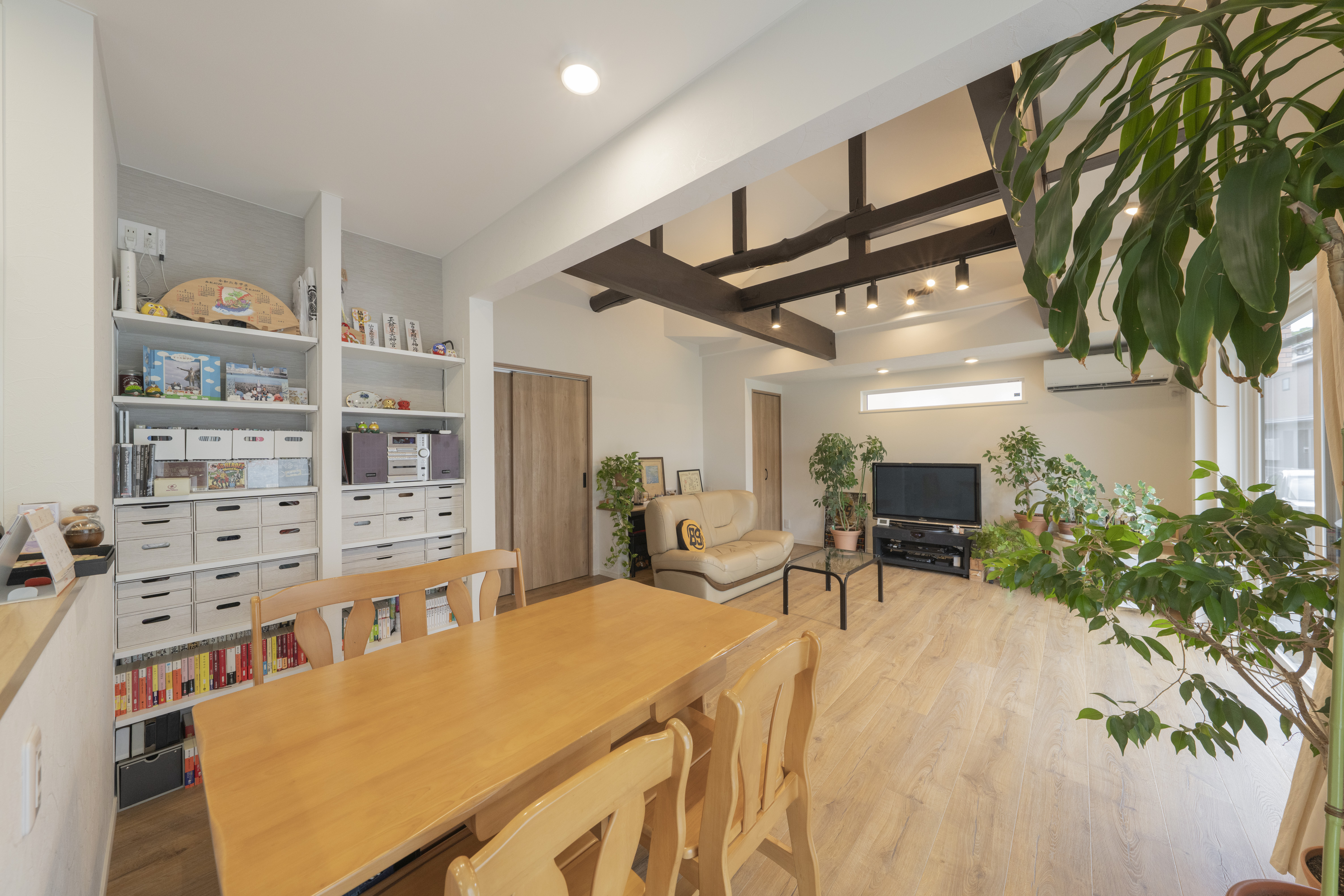 以前の和室とリビングダイニングを間取り変更して、ひとつながりの明るい南面LDKとしました。リビングの勾配天井部分には既存の梁を補強して新たな表しとし、空間デザインのアクセントになっています。断熱材を施しているので勾配天井(吹抜け)でも一年中快適に過ごすことができます。