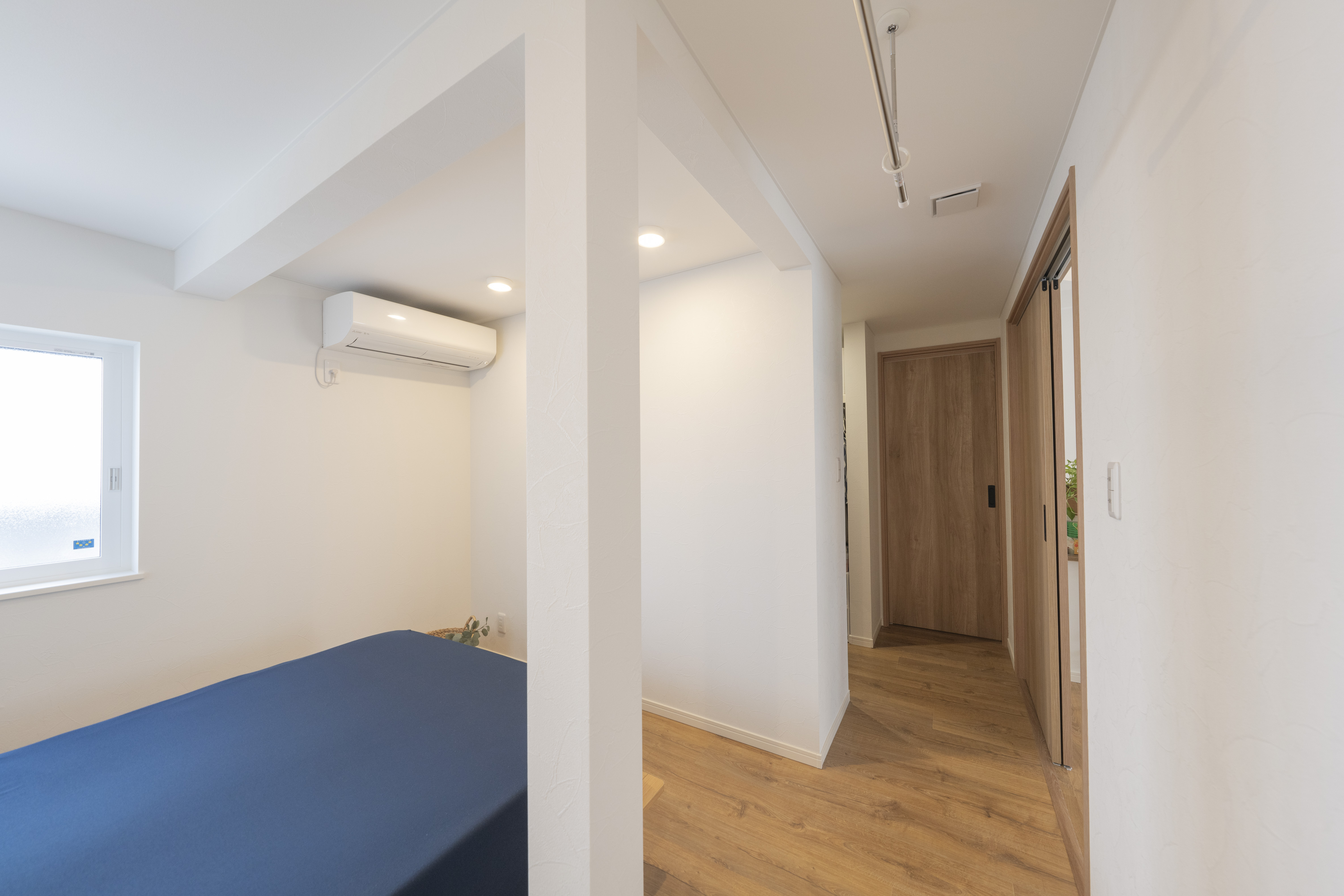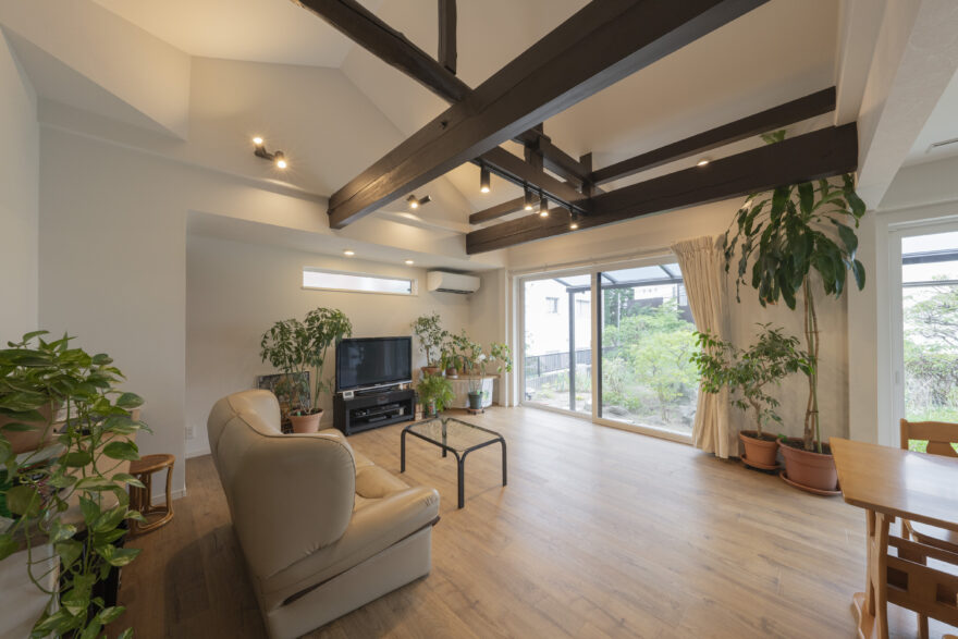 天井・壁・床下の断熱施工と全窓を高断熱樹脂サッシへ交換し、ZEH基準相当の断熱等級5へ断熱性能を向上させています。また、24時間集中換気の設置で健康な空気質で快適な空間に一新されています。