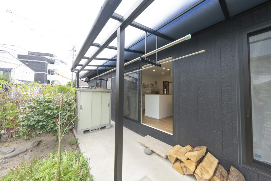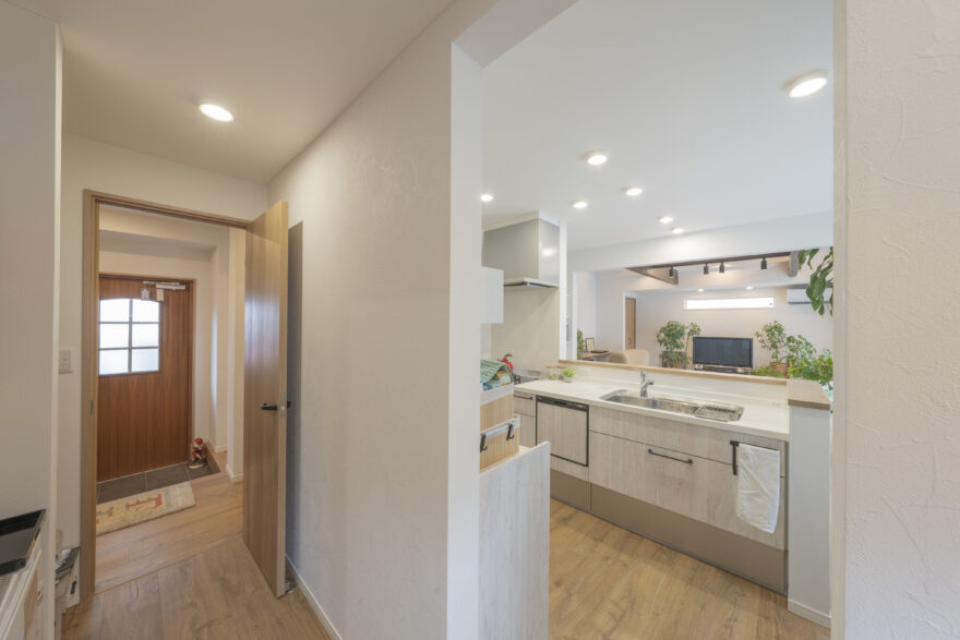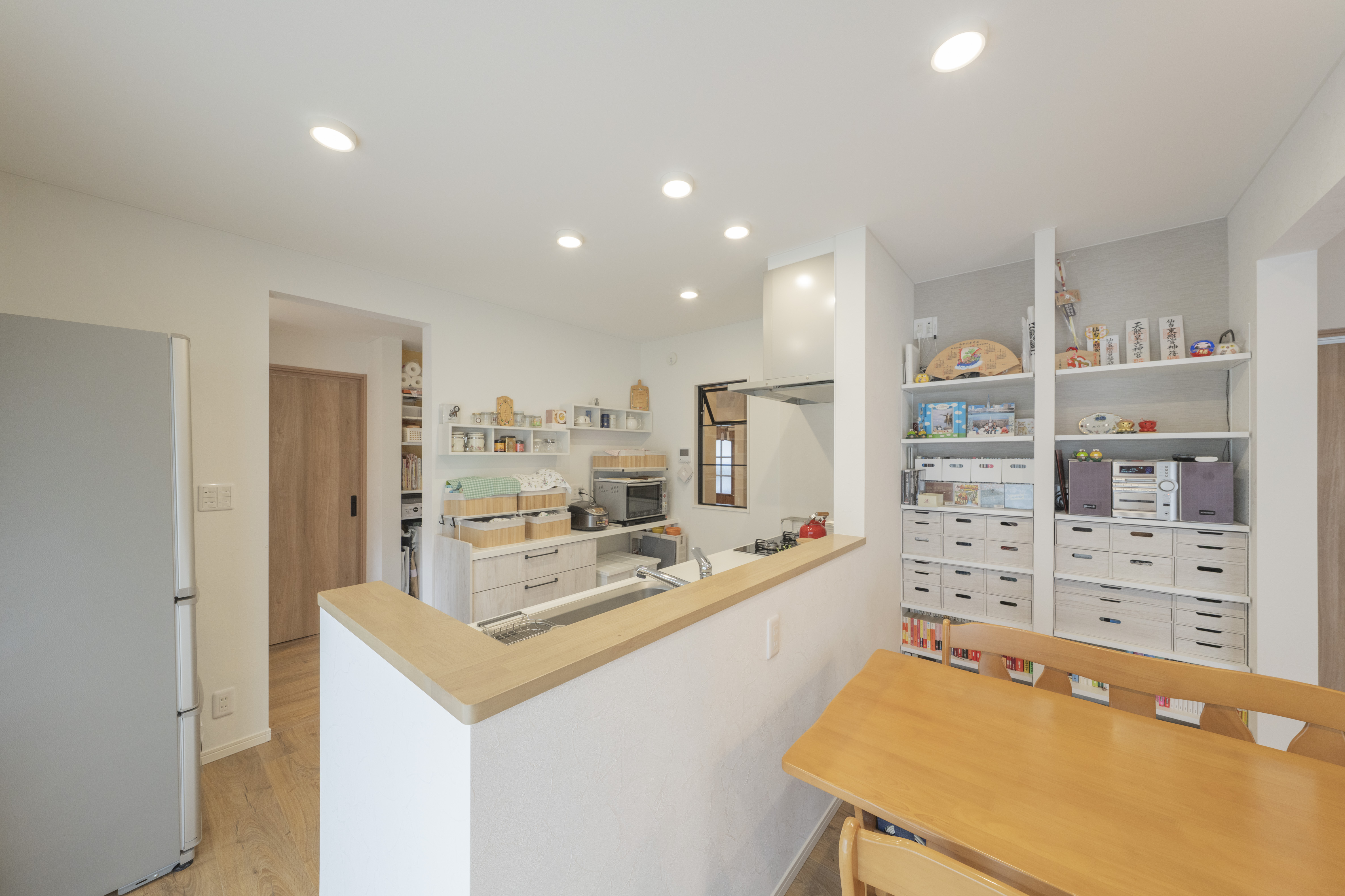 これから広いお庭を活かして園芸を愉しみたいという奥様のご要望から、家庭菜園の作物を庭からキッチンへ運ぶ動線にも配慮してプランニング。庭からキッチンまで直線の動線なので使い勝手抜群ですね。