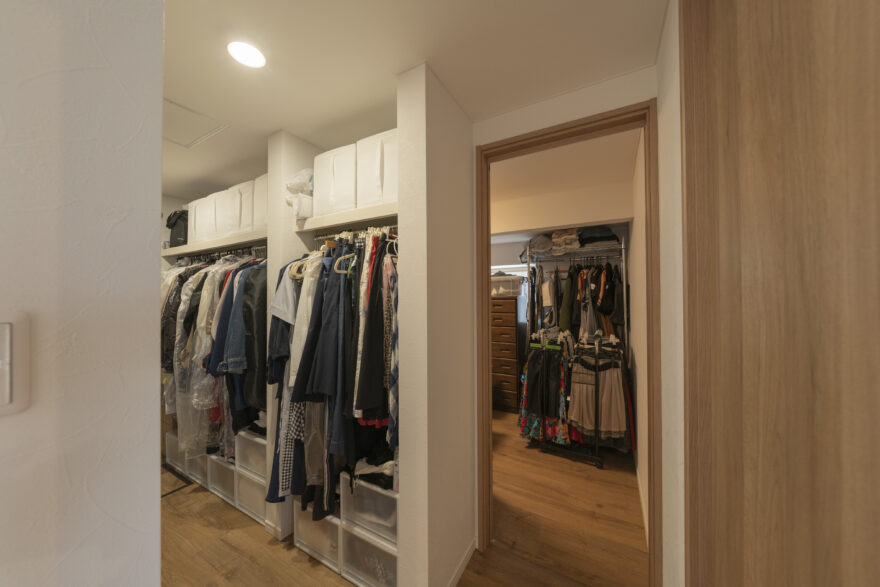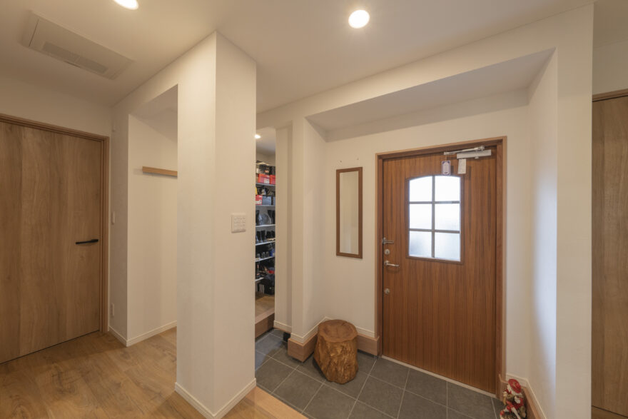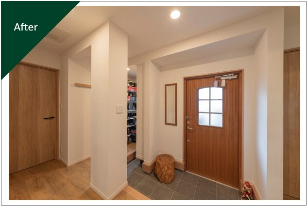 以前は玄関が2つありましたが、位置を変更して空間も広くなりました。新たな玄関にはシューズクロークを設置し使い勝手も向上しています。
