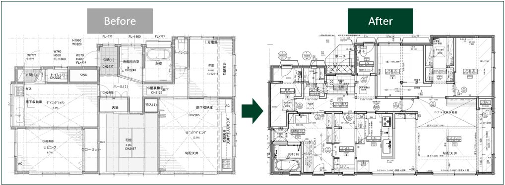 マンションにお住まいだったご夫婦。奥様の実家である築70年の平家が空き家になっており、解体などを検討していた際に柱や梁がしっかりしていることから、リフォームという選択肢を検討されたことがきっかけでした。弊社主催のセミナーにご参加いただき、性能向上リノベーションがもたらす健康維持増進に共感してくださり、ご実家へ住み替えるためのリノベーションを選択されました。