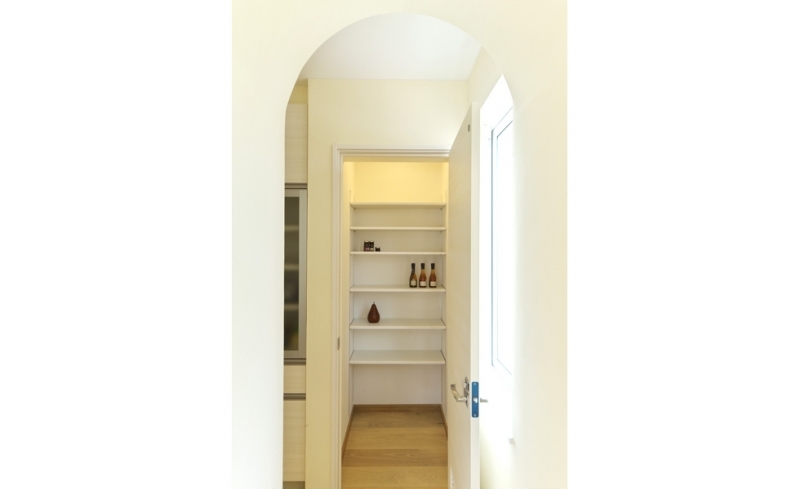 キッチン両脇はぐるっと回れるようになっていて、家事や子育てだけでなく、お友達が遊びに来た際の動線も考えたプランです。キッチンに立つとウッドデッキまで一直線に視界が伸び、エクステリアと連動した計画になっています。